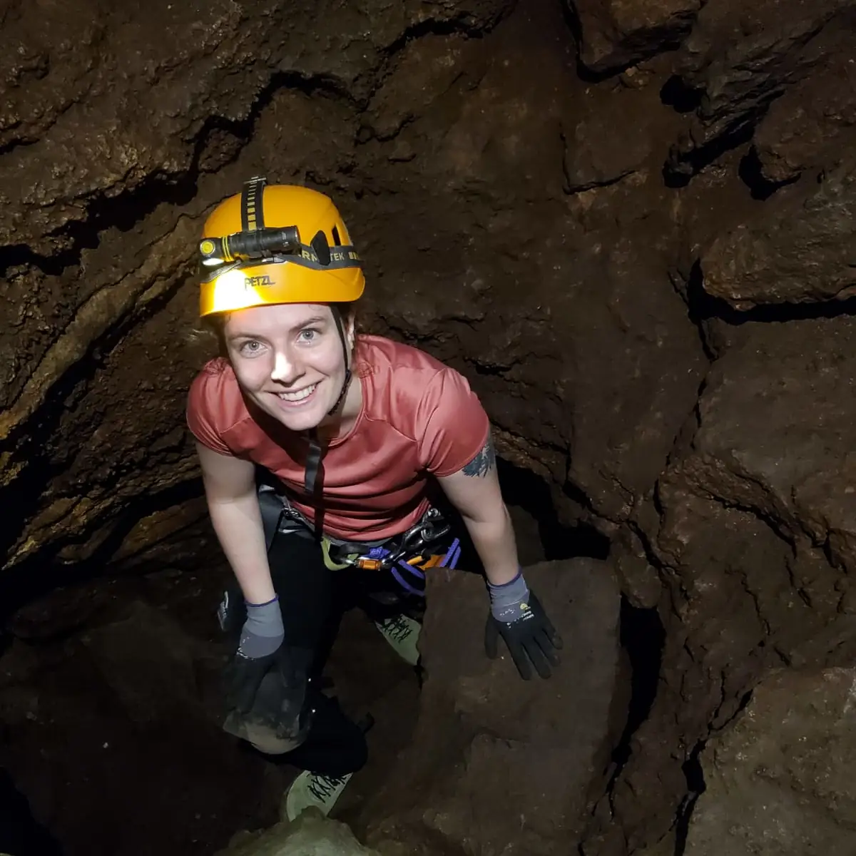 Nous fournissons à chaque participant l’équipement nécessaire à la visite du tunnel de lave en toute sécurité : un baudrier, un casque, une paire de gants et des genouillères.