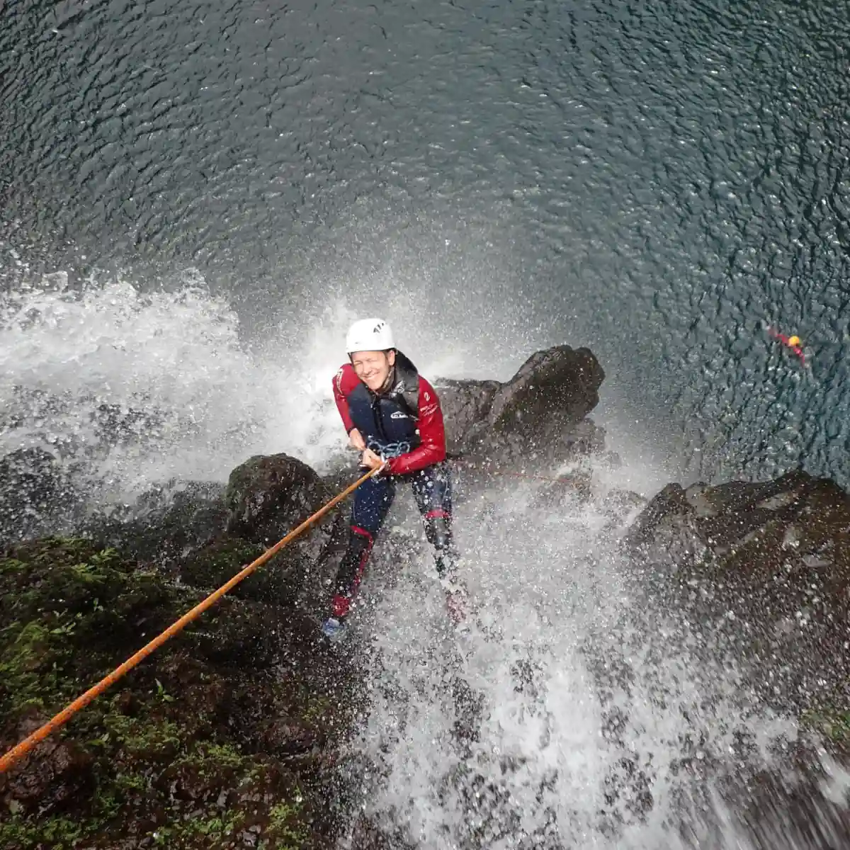 Après les rappels de Fleurs Jaunes classique vous poursuivez la descente du canyon jusqu’à la Chapelle, pour une mémorable descente en rappel de 90m plein vide.