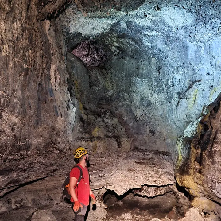 Au fil de l’exploration, vous évoluez dans des sections où la lumière naturelle perce parfois le tunnel, mettant en valeur les reliefs façonnés par la lave, ainsi que les structures minérales caractéristiques de ce milieu. Le parcours alterne entre zones ouvertes et passages plus engagés, rendant l’expérience dynamique et immersive.